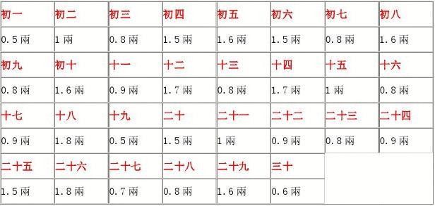 初一:五钱 初二:一两 初三:八钱 初四:一两五 初五:一两六 初六:一两五 初七:八钱 初八:一两六 初九:八钱 初十:一两六 十一:九钱 十二:一两七 十三:八钱 十四:一两七 十五:一两 十六:八钱 十七:九钱 十八:一两八 十九:五钱 二十:一两五 廿一:一两 廿二:九钱 廿三:八钱 廿四:九钱 廿五:一两五 廿六:一两八 廿七:七钱 廿八:八钱 廿九:一两六 三十:六钱