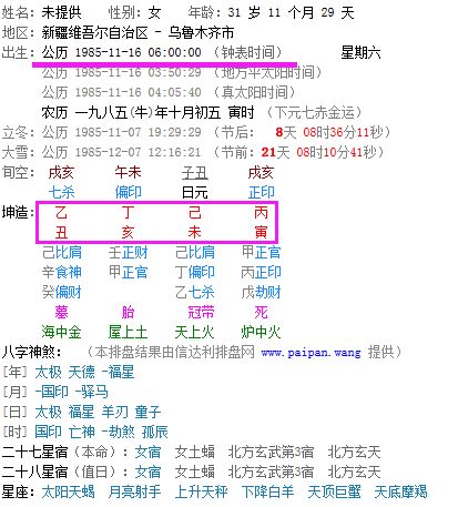 例如:某女命于农历 一九八五(牛)年十月初五早上六点在维吾尔自治区 乌鲁木齐市出生,如果不按真太阳时排八字的话,生辰八字是:乙丑 丁亥 己未 丁卯。如果按照真太阳时排出的生辰八字是:乙丑 丁亥 己未 丙寅。