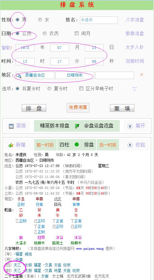例如:某男于公历1975年7月23日13时17分在西藏自治区日喀则市出生,使用在线排盘工具查出他的八字是:乙卯 癸未 庚午 壬午。他的日柱和时柱神煞中各带有一个天乙贵人。