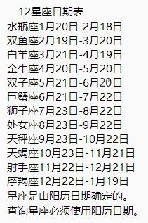 星座是按阳历(公历)日期划分的,首先你得知道你的阳历出生日期,然后对照下面的资料。